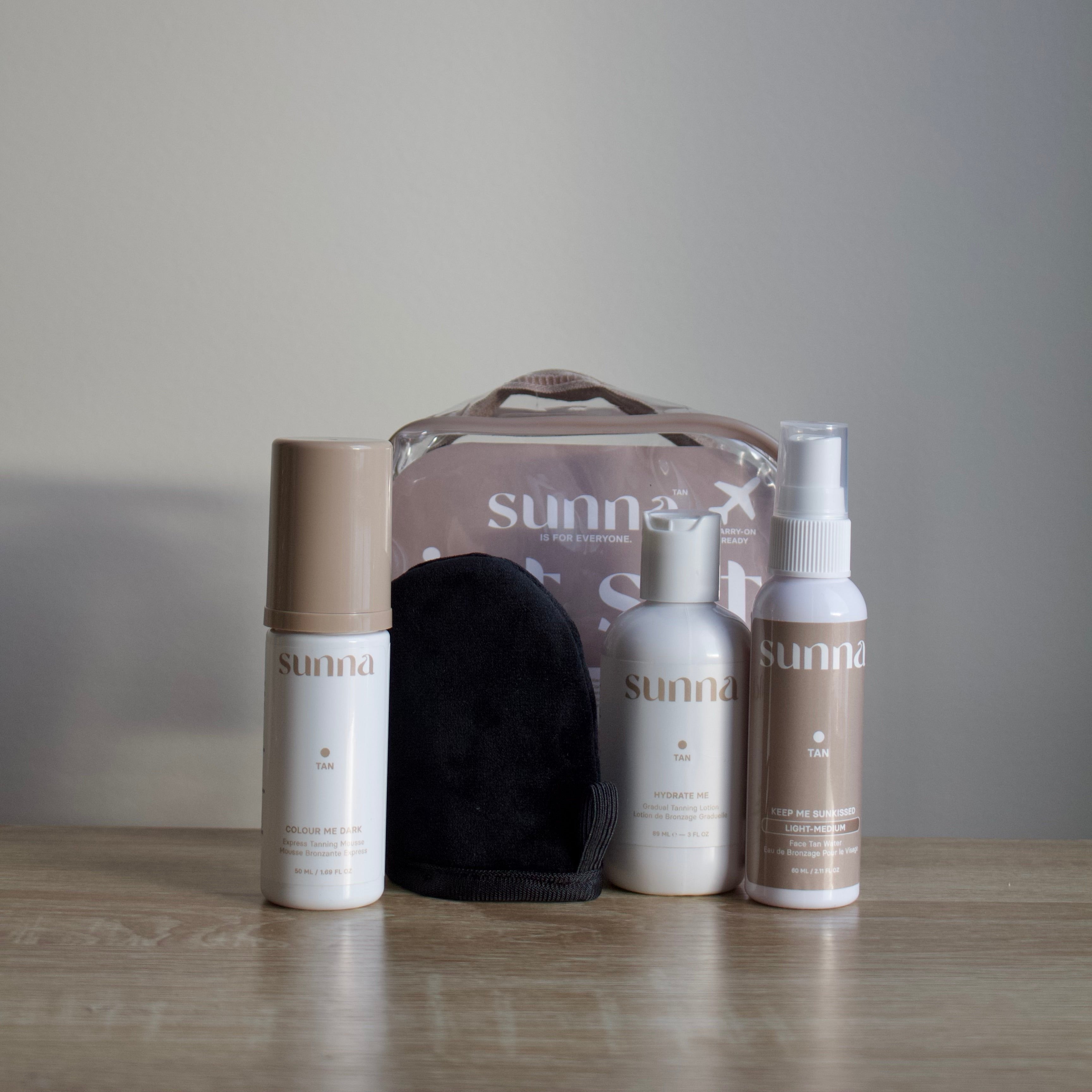 Brand new to the Sunna Fam! Our Best Selling Travel pack just levelled up in this adorable travel bag and NEW mini mitt! The Jet Set Travel Pack is sure to become an easy upsell at every appointment.