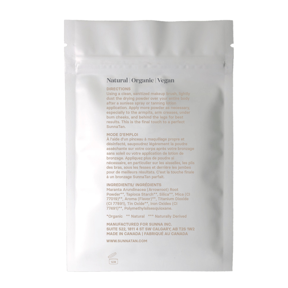 Directions for use: Using a clean, sanitized makeup brush, lightly dust the drying powder over the client's body especially in areas where the client will feel sticky: armpits, arm creases, under bum, behind the leg.