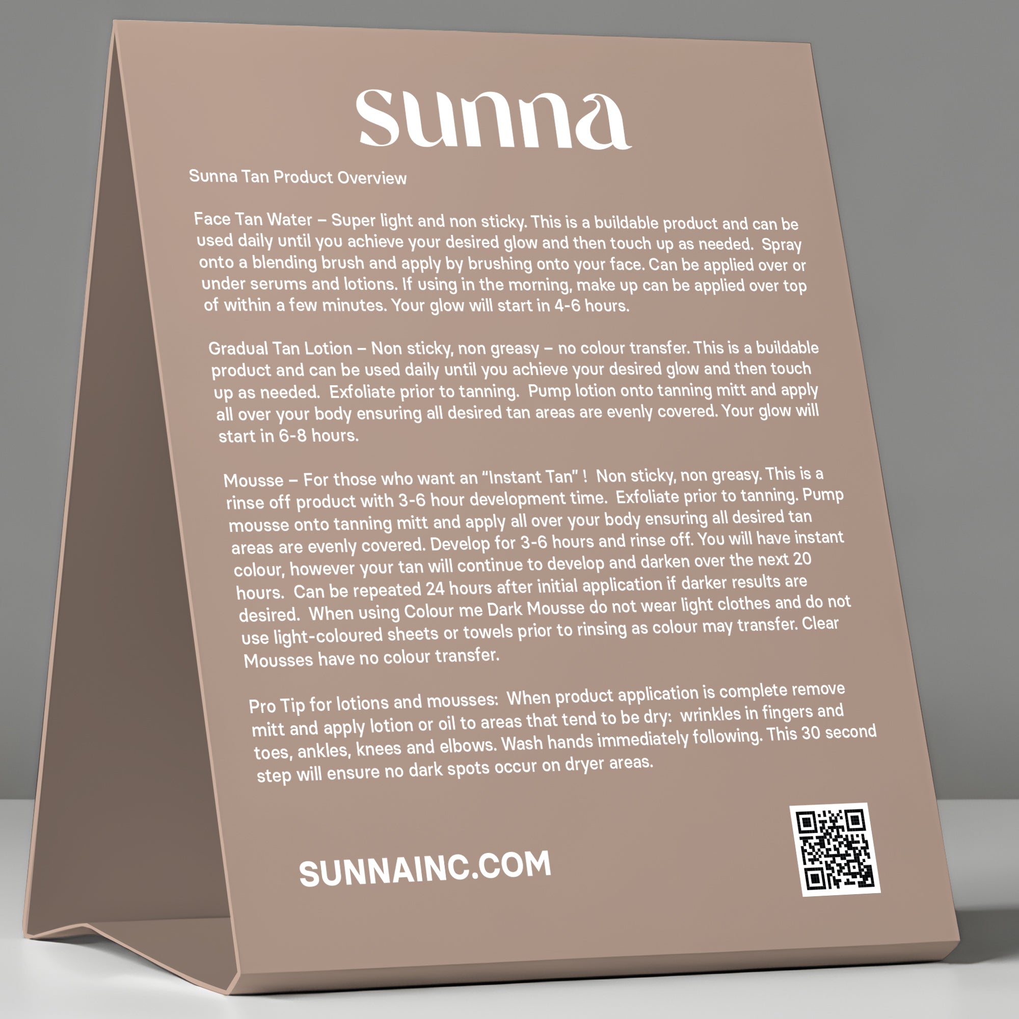 Sunna tent card providing key product information for retail products, including mousse, gradual tan and face tan products. No charge item, limit 4 per location.