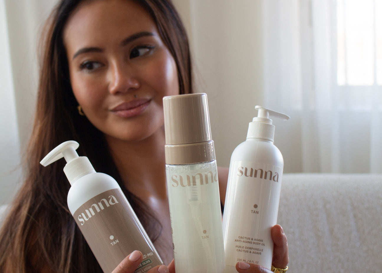 Lineup of SUNNA products on a shelf against a plain wall.