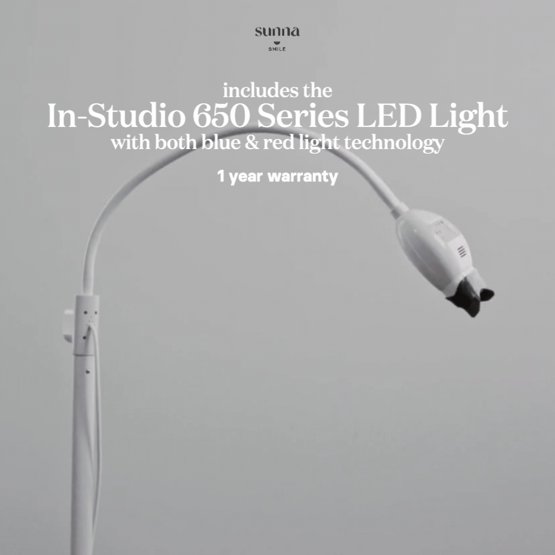 The SunnaSmile In-Studio LED light is one of the most advanced teeth whitening lamps available. The light combines both blue light to activate the whitening gel and red light to stimulate cellular regeneration. This unit is great for a busy salon or spa location as it is adjustable to a variety of seating arrangements. The look and feel of this light will WOW your clients!